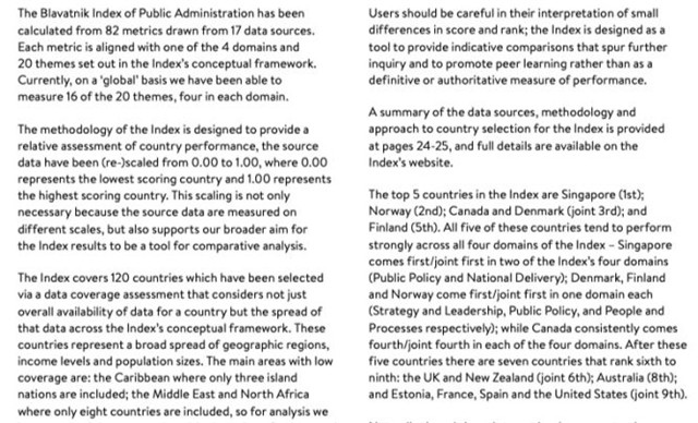 英國牛津大學(xué)的布拉瓦尼克政府學(xué)院于2024年12月5日公布了最新布拉瓦尼克公共行政指數(shù)報告(Blavatnik Index of Public Administration),比較了全球120個國家的公共管理部門。新加坡民事服務(wù)全球居冠。新加坡在邊境服務(wù)、稅務(wù)管理創(chuàng)新策略和實踐方面領(lǐng)先全球其他國家。