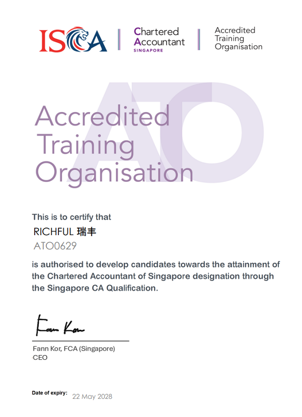 近期,RICHFUL瑞豐通過新加坡特許會計師協會(The Institute of Singapore Chartered Accountants, ISCA)審核,正式獲得“認證培訓雇主”(Accredited Training Organisation, ATO) 資格。該資質表明RICHFUL瑞豐在會計人才培養體系及專業實踐機制上符合ISCA國際標準,為企業深化國際化人才戰略奠定基礎。