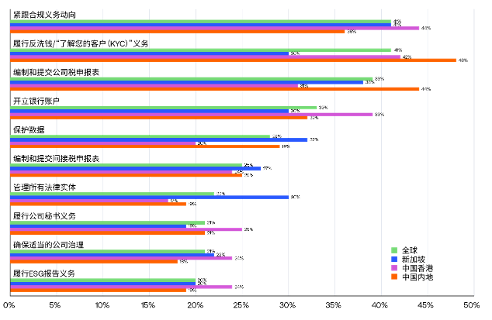 圖表顯示了企業(yè)在其他國家或地區(qū)設立和管理法律實體時面臨的重大挑戰(zhàn)(受訪者排名前三位)